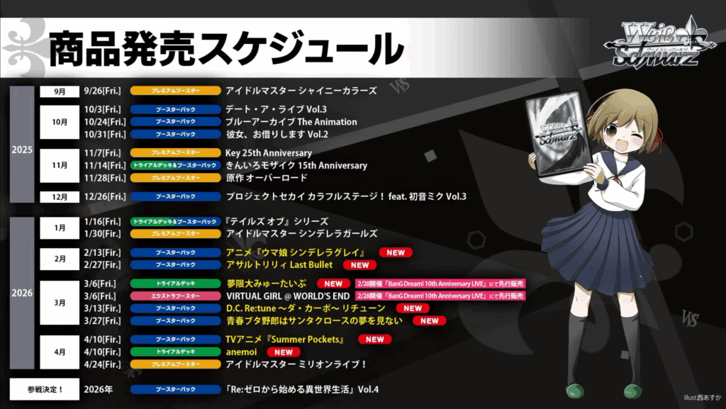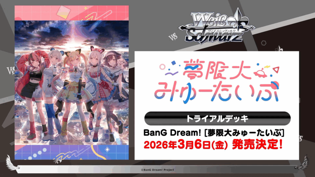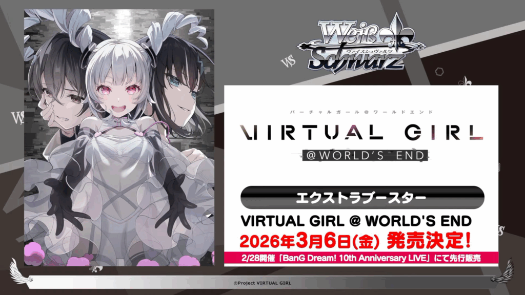 A brand new IP that’s recently released this year in June, Virtual Girl@World’s End is a visual novel that is directly published by Bushiroad. Featuring a post apocalyptic setting, the story begins when a mysterious virtual idol by the name of Ai arrives in a desolate landscape ready to share her song. There are prepurchases that will be taking place at the BanG Dream! 10th Anniversary Live on February 28th, 2026. Releasing officially simultaneously on March 6th, 2026 with BanG Dream! Mugendai Mewtype with its own extra booster, the series is Neo-Standard with that series as well.