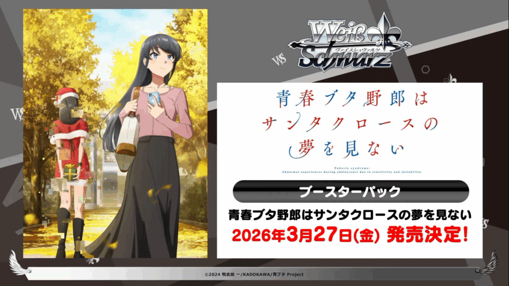 Readying for an encore, Bunny Girl returns with another entry to the series with the this full booster release on March 27th, 2026. Mai and friends return with another entry to their tale. The cast has grown up and is now attending university. With their entry into adulthood, new troubles alongside new experiences are bound to appear for the already existing Bunny Girl cast.