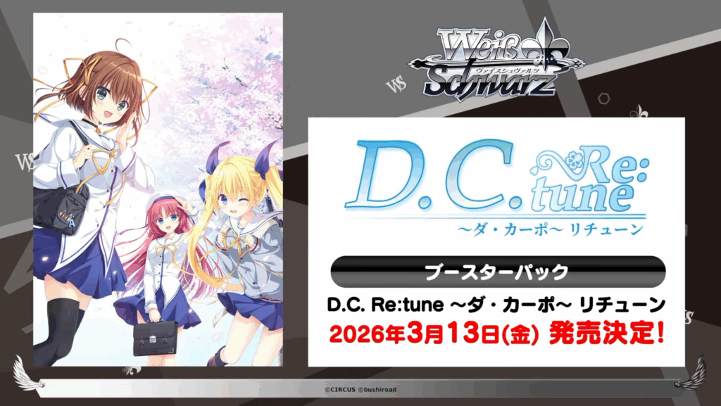 A new entry into the Key family of visual novels, anemoi follows a brother and sister duo who return to their childhood town while meeting charming folks new and old and opening a special time capsule. Not much is yet known about the visual novel, but make sure to keep an eye out if the premise interests you. There is a trial deck release coming on April 10th, 2026 and a full booster to follow down the road.