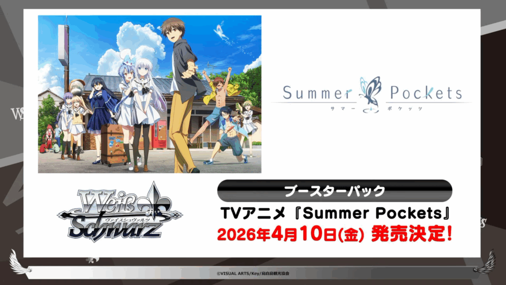 Speaking of Key series, Summer Pockets‘ anime received its own full booster coming out simultaneously on the same day (April 10th, 2026) as the trial deck for Anemoi. Hairi has come to an island that was inhabited by his late grandmother. He has returned to handle the affairs of her estate, but while doing so, he becomes enamoured by the many interesting inhabitants of the island alongside some unique and special magical secrets.