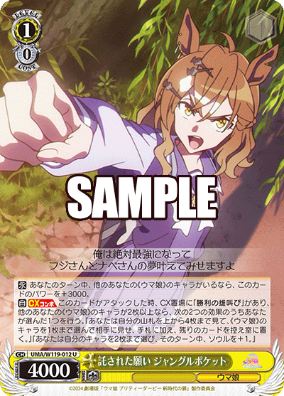 Yeah, I got no clue. Anyways, Jungle Pocket is the queen of the jungle. This whole deck revolves around building up to Jungle Pocket. When Jungle Pocket attacks with her combo, she deals a single point of damage to your opponent x times equal to the number of markers she possesses. For two markers or less, you’ll deal the damage once, for three, it will be twice, and for four or more, it will be three times.