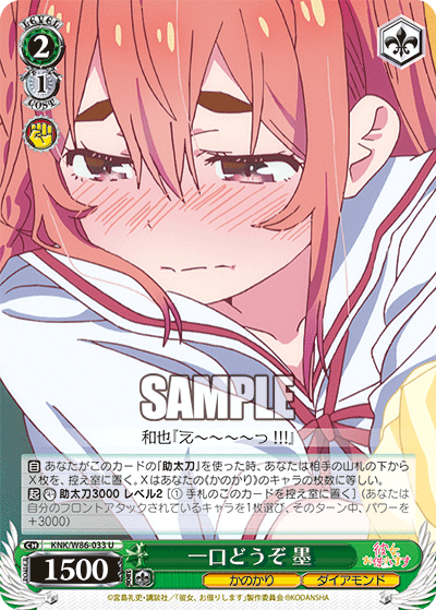 Other support pieces throughout the game include the cards above. Sumi playing with a beach ball is the Riki profile for the deck, letting you clock a character from waiting room to reveal the top card of your deck and add it to hand if it’s a character or a specific event (we don’t run any events). Sumi holding her notebook is a card I cannot afford is a Clean Cut profile that can give power to any character on swing including herself. Lastly, Sumi looking innocent at the café is a level swap profile that can also sacrifice itself to add a character from the top four cards of your deck.